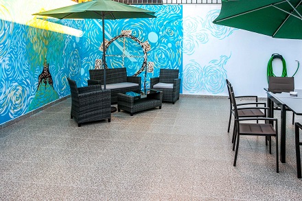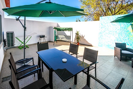 80m2 com zona de refeições, churrasco, lounge, baloiço. Enquadrado com pintura de artista local.